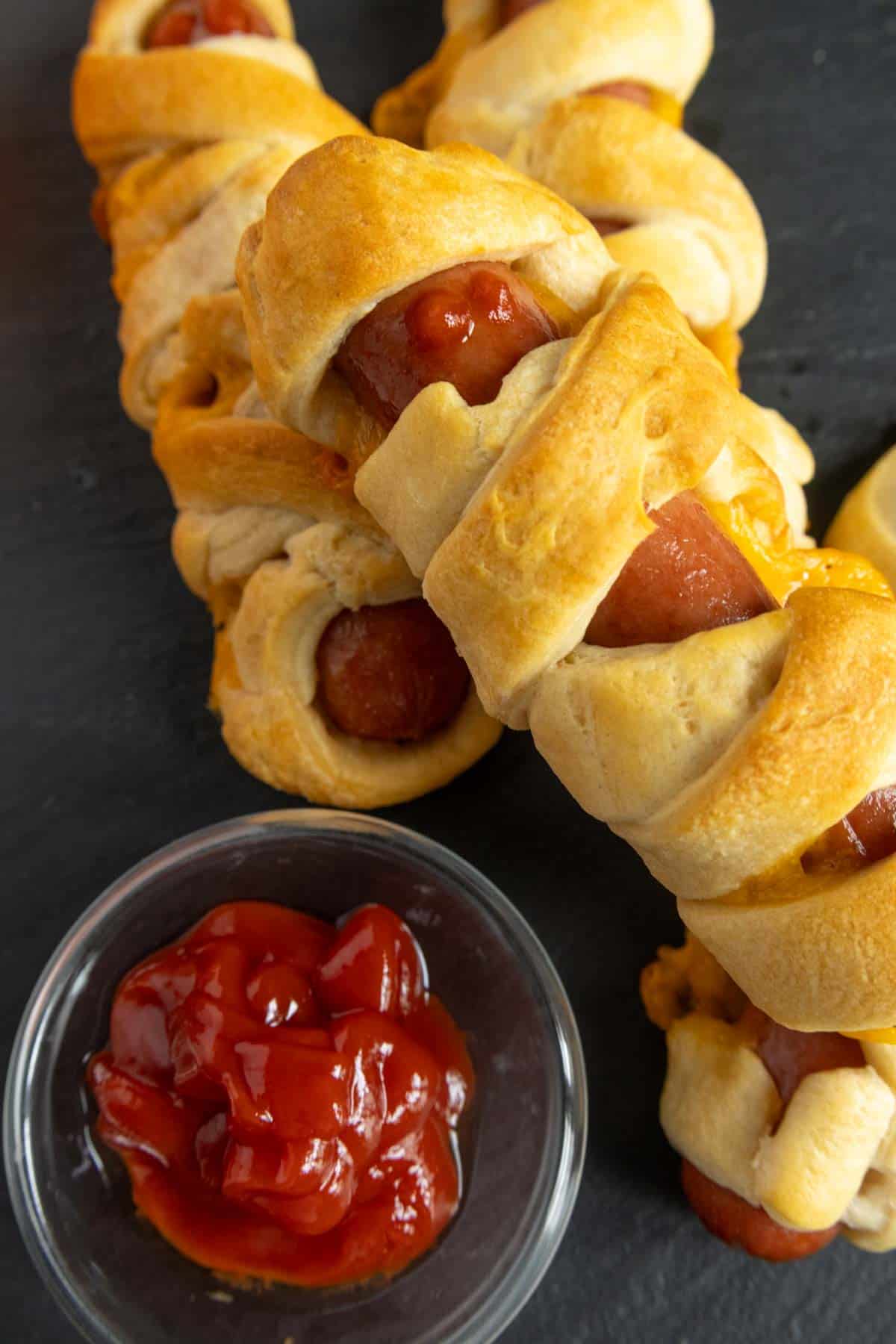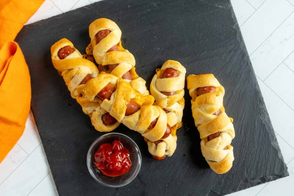 Mummy hot dogs are basically just larger pigs in a blanket, with the simple addition of sauce eyes! Even my husband loves these, because they make him feel like a kid again (and who doesn’t love an excuse to eat hot dogs?).