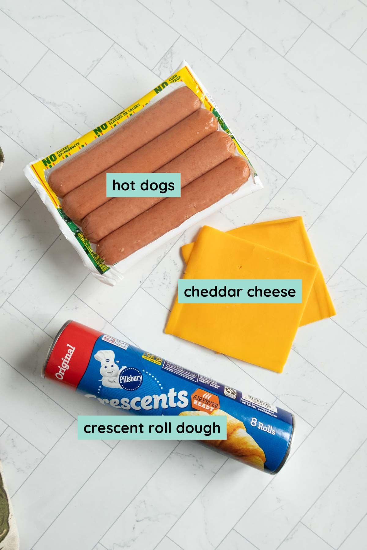 - Hot dogs – Use standard length dogs. Any flavor or variety will work here, but I always go with classic hot dogs.