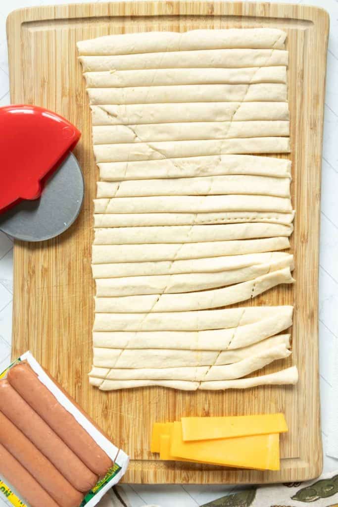 - Unroll crescent roll dough onto a cutting board. Gently press the seams together to seal. Cut into at least 16 thin strips. Cut cheese slices into 4 strips each.