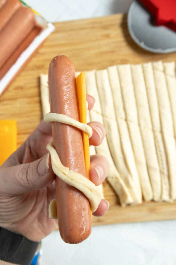 - Repeat until all of the hot dogs and dough is used, adding extra dough strips to the dogs as needed. Make sure there is a little unwrapped hot dog near one end if you plan to add eyes.