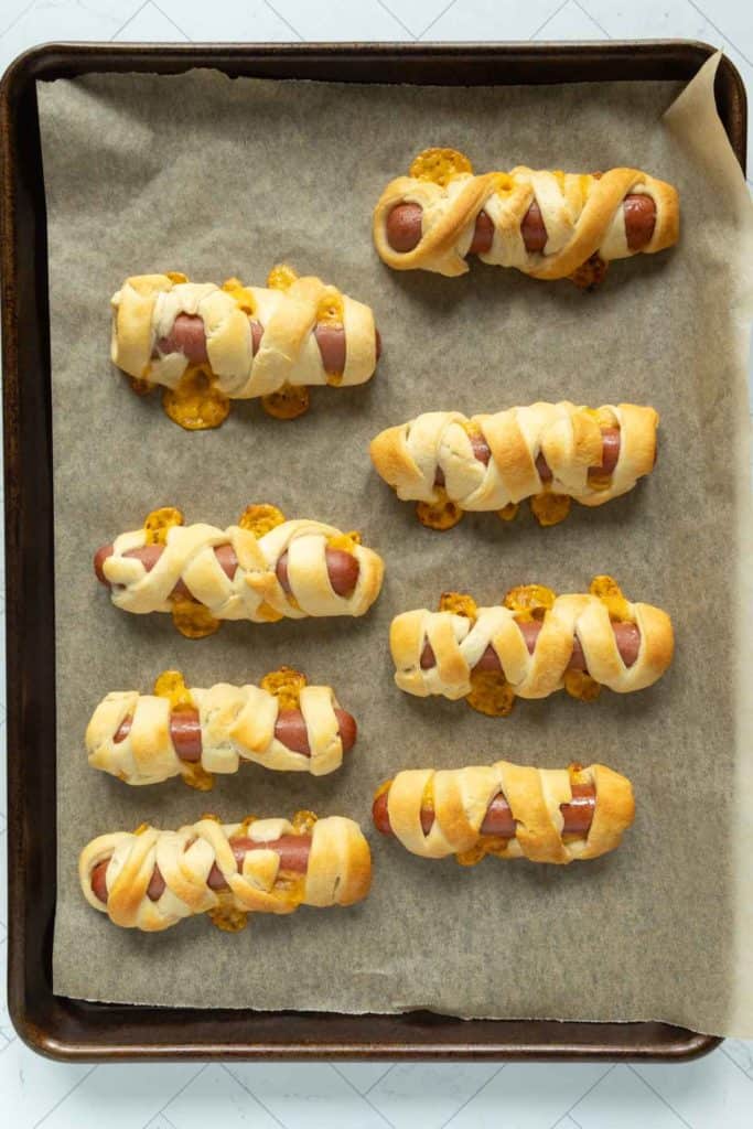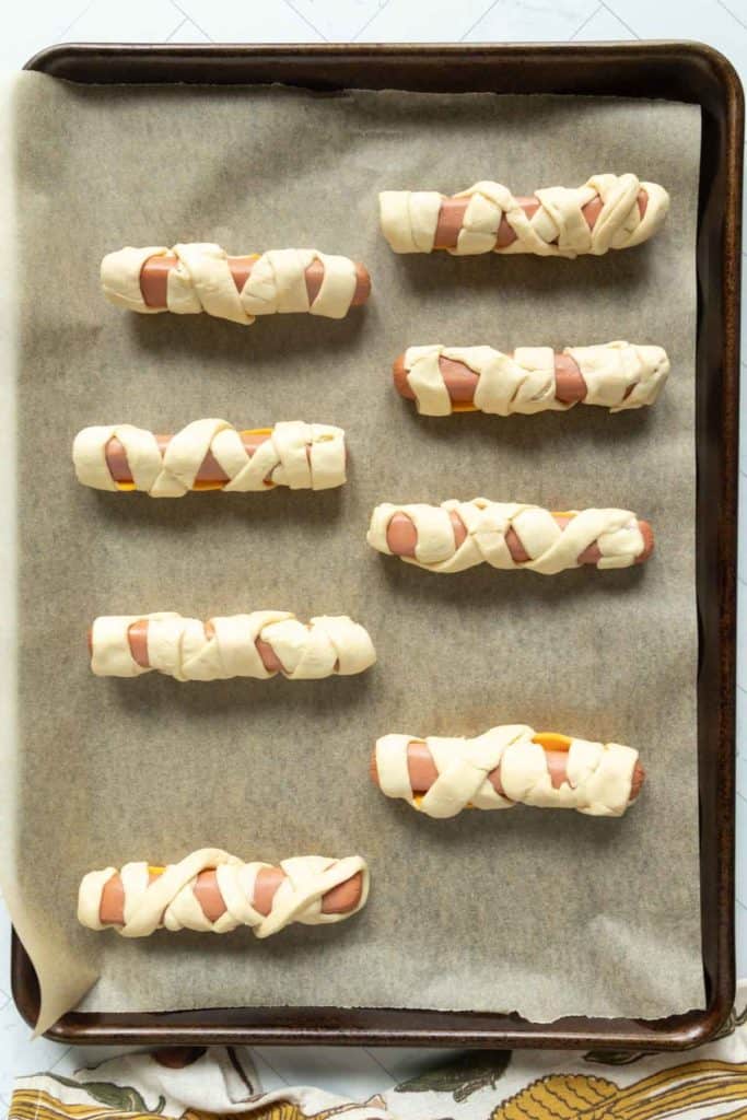 Place the wrapped mummies on a baking sheet and repeat until all the dough and hot dogs are used.