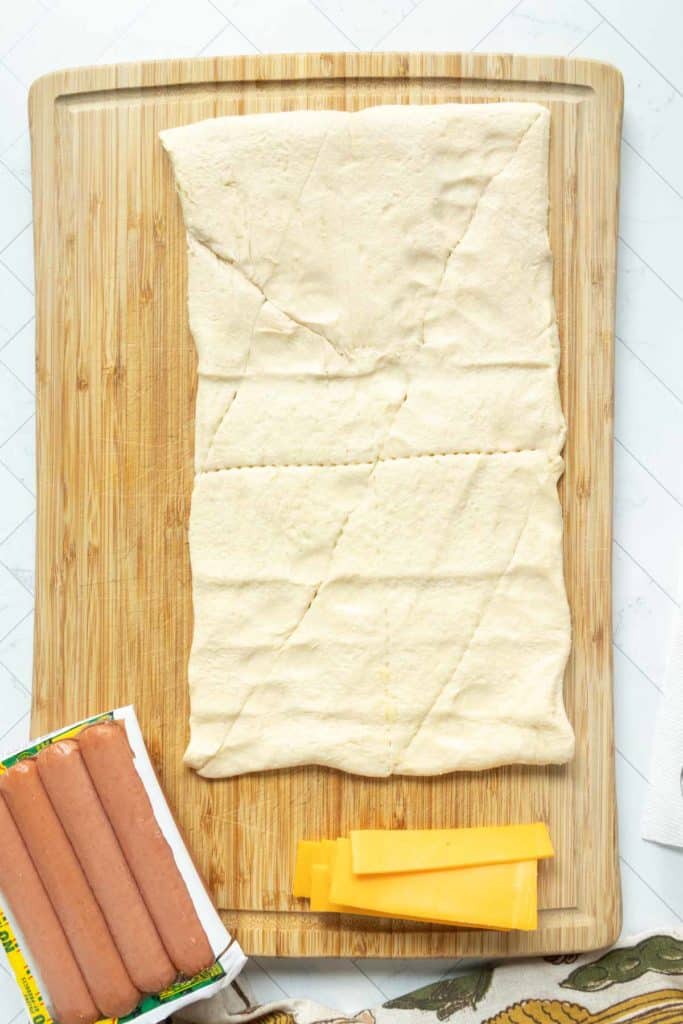 Unroll your crescent dough onto a cutting board so it lays flat. Press the seams together with your fingers to seal as best you can.